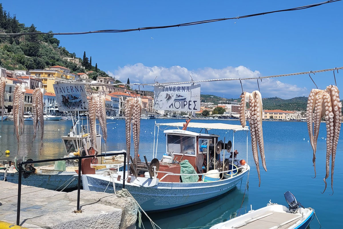 Spazieren Sie entlang des malerischen Hafens von Pylos, wo Sie zahlreiche Fischerboote und Jachten sehen können. Genießen Sie den Blick auf das türkisfarbene Wasser und beobachten Sie das geschäftige Treiben der Fischer.
