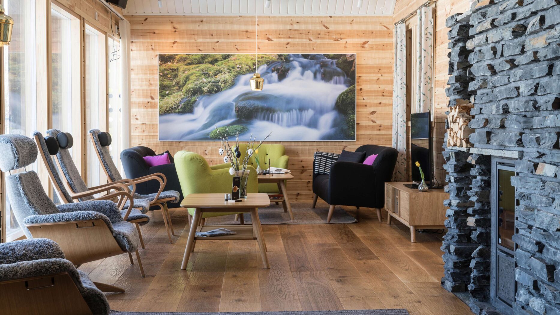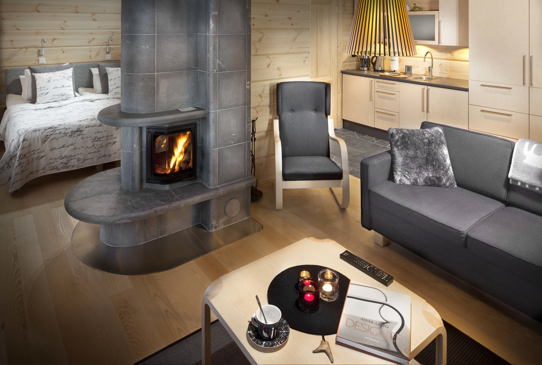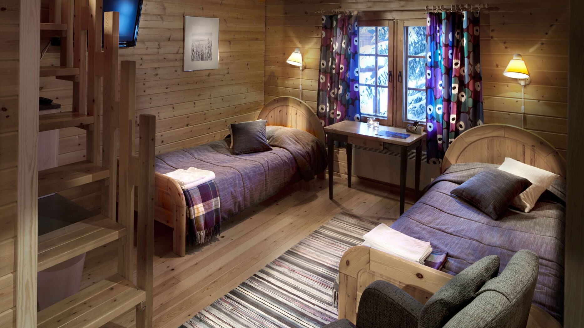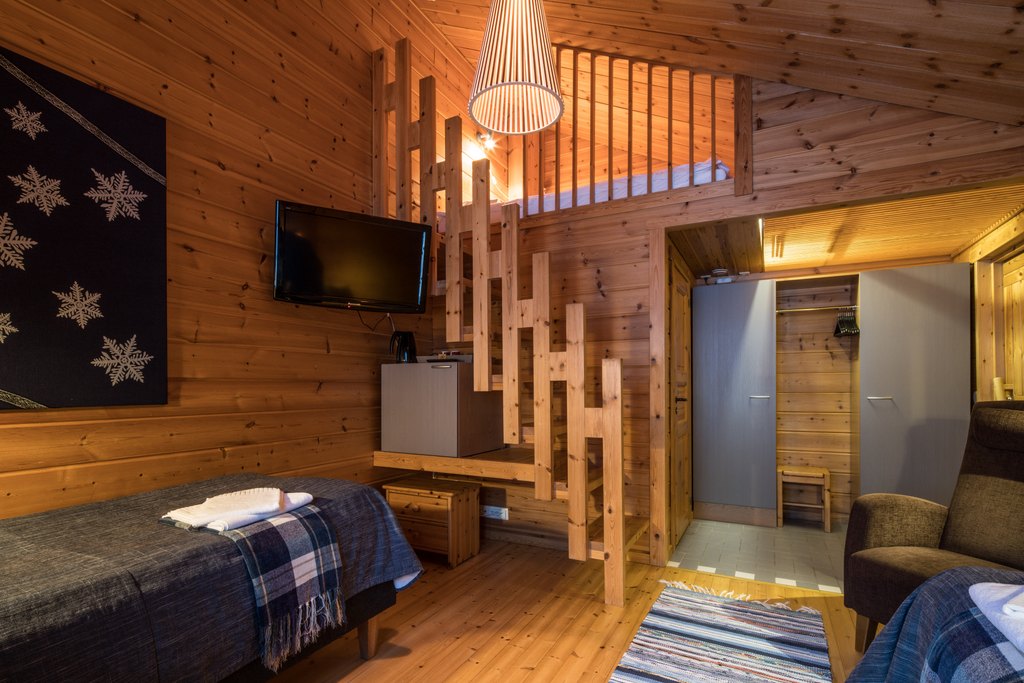 Die 32 gemütlichen, typisch finnischen Standardzimmer haben im Haupthaus je zwei separate Betten. Vier Zimmer bilden ein Blockhaus. Auf der kleinen Galerie ist Platz für zwei Zusatzbetten für Kinder. Insgesamt acht Zimmer haben keine Galerie, stattdessen aber eine Gemeinschaftssauna und einen gemeinsamen Aufenthaltsraum mit Cheminée.