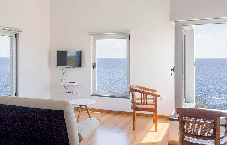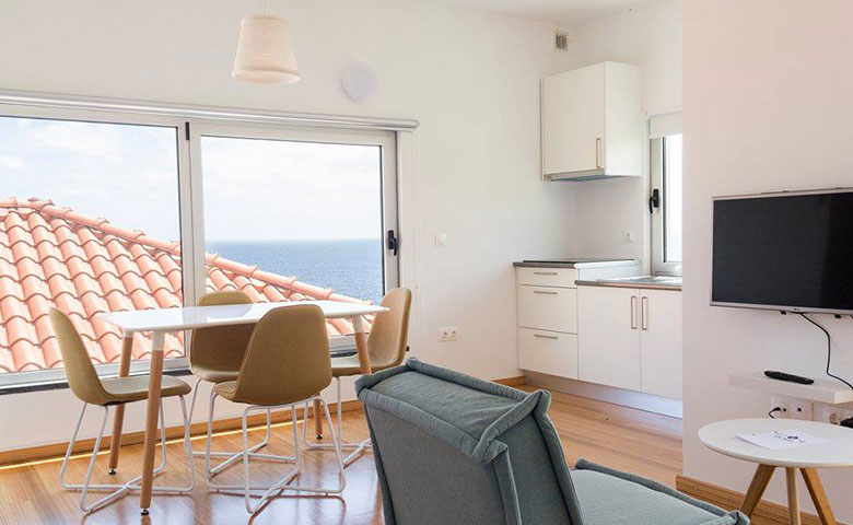 Zimmer: Nur die kaum befahrene Uferstrasse trennt das Aparthotel vom Atlantik. Jedes der 7 Studios ist mit einem Doppelbett, einem Schlafsofa, einer Kochecke, komplett eingerichtet, und einem Bad ausgestattet. Gratis WIFI, TV und Klimaanlage sind selbstverständlich. Alle Zimmer haben Blick auf den Atlantik, den Hausberg von Horta oder die Nachbarinsel Pico.